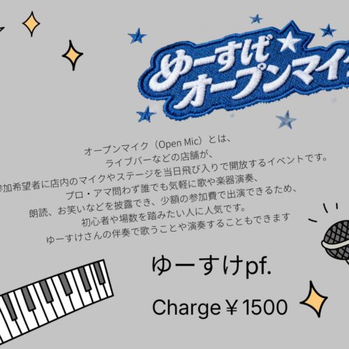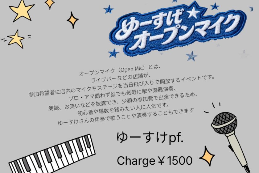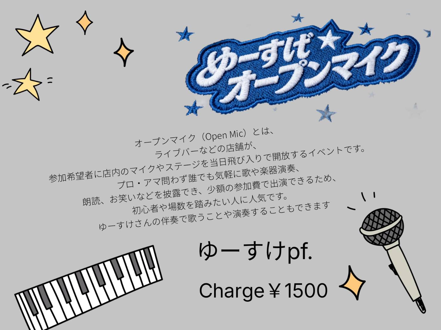 ゆーすけオープンマイク 3月 19 Thu 2026 オープンマイク ゆうすけオープンマイク!!! https://sites.google.com/view/yskpssw/ OPEN 18:30 START 19:00 CHARGE 1500 前のスケジュール 次のスケジュール