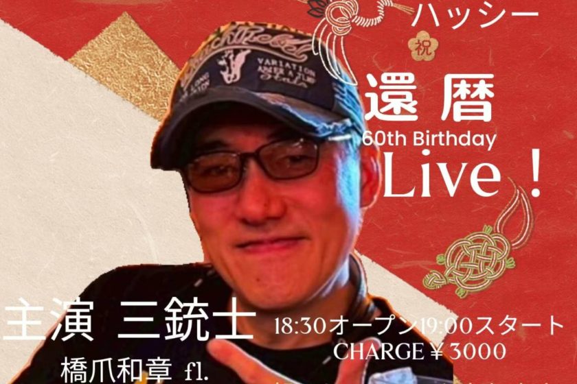 還暦60th Birthday Live! 1月 17 Sat 2026 LIVEセッション 橋爪和章(fl) 坂野尚雄(fl) 伊藤泰子(fl) OPEN 18:30 START 19:00 CHARGE 3000 前のスケジュール 次のスケジュール