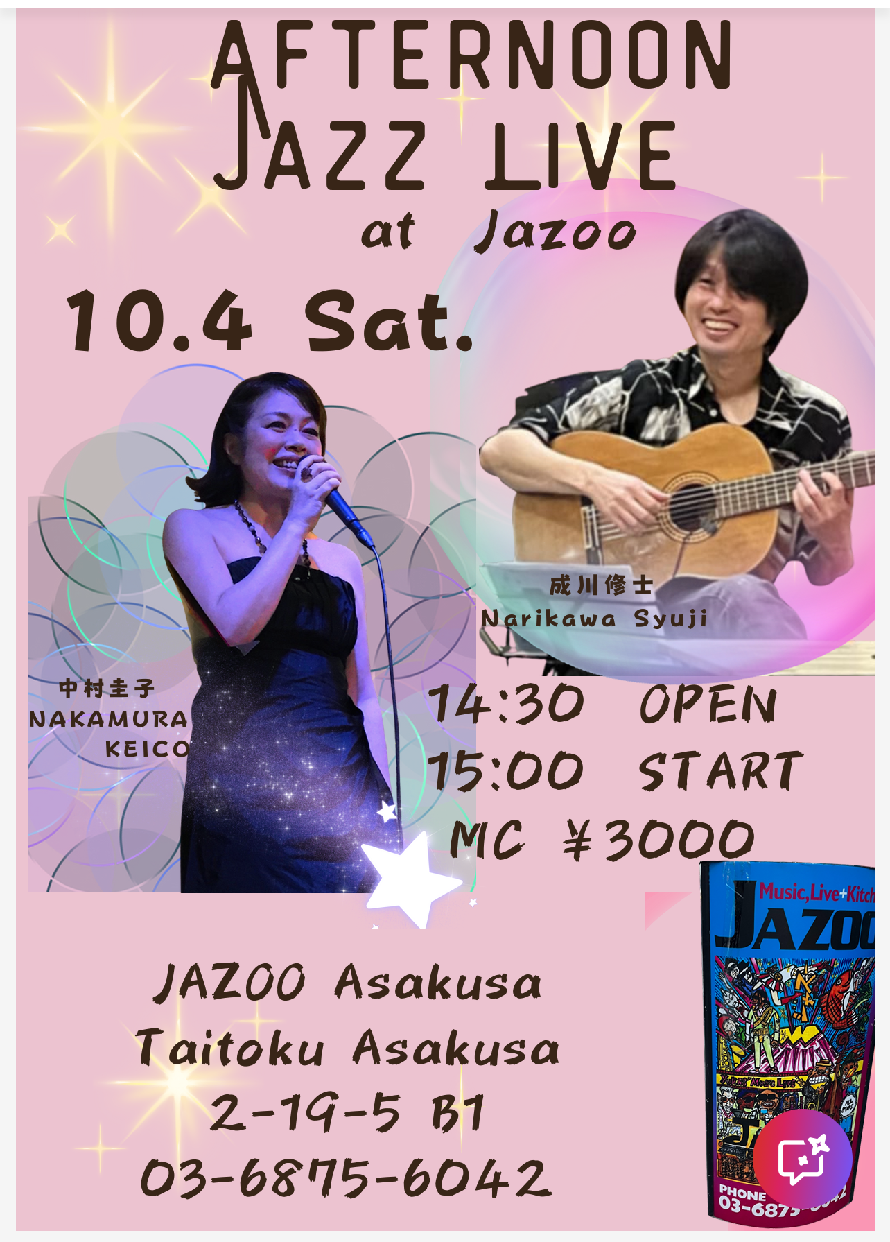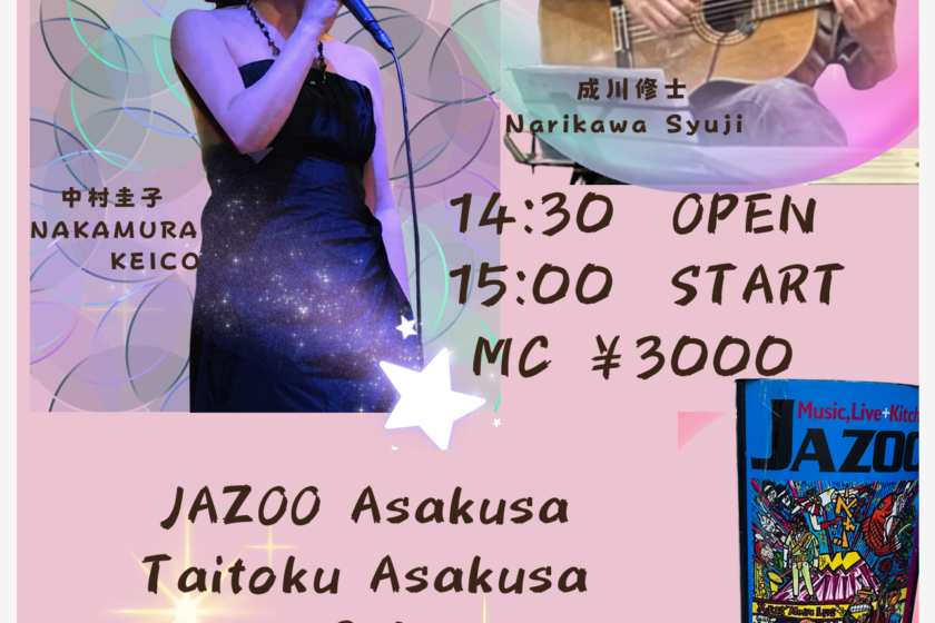 中村圭子 AFTERNOON JAZZ LIVE 10月 4 Sat 2025 LIVE 中村圭子(Vo) 成川修士(gt) OPEN 14:30 START 15:00 CHARGE 3000円 前のスケジュール 次のスケジュール