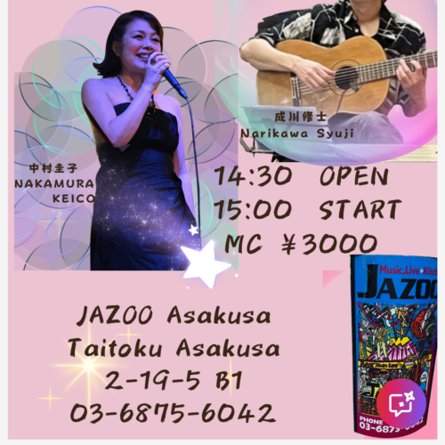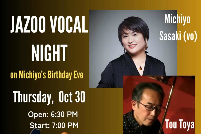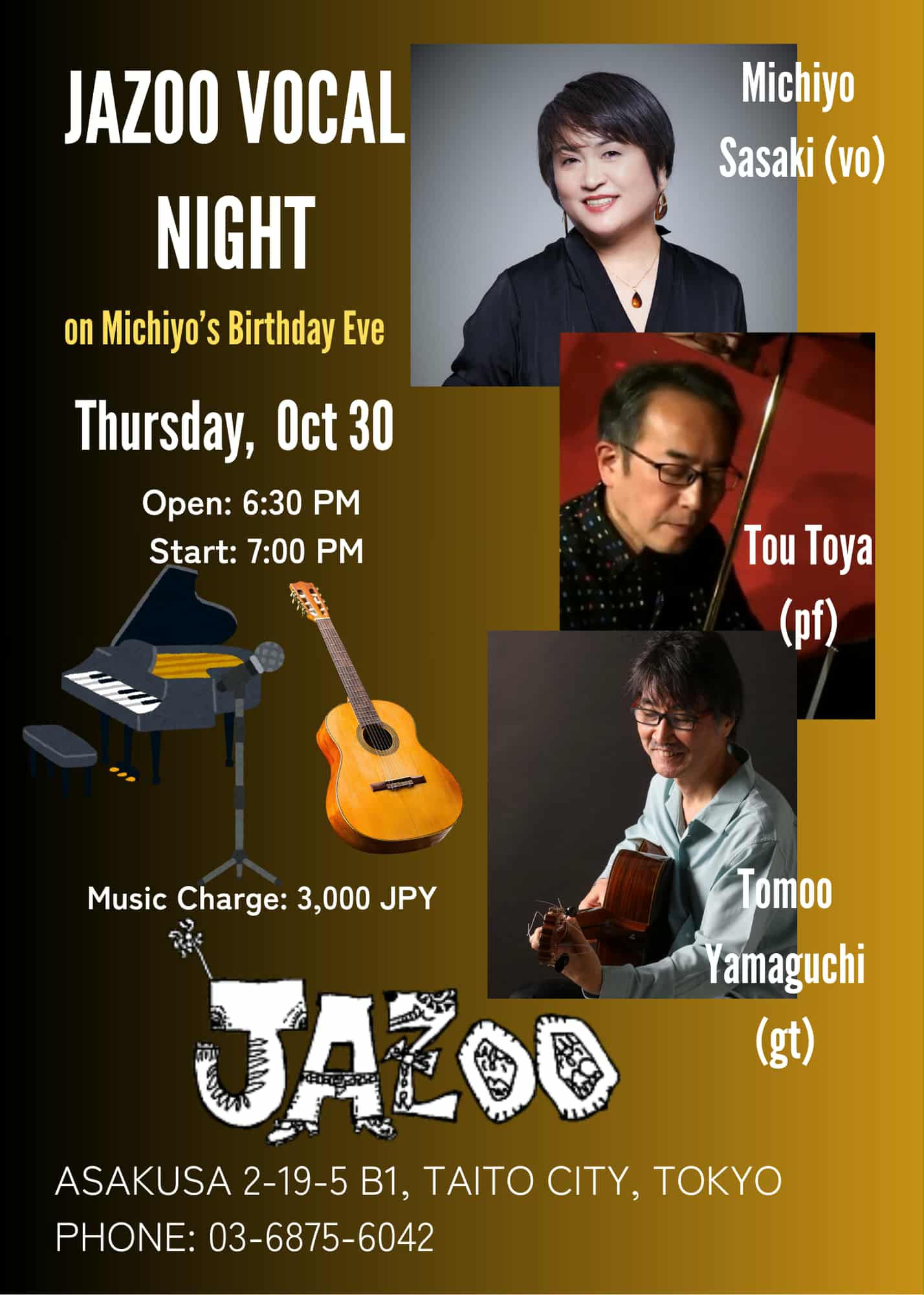 佐々木美智代~Birthday Eve Spatial LIVE! 10月 30 Thu 2025 LIVE 佐々木美智代(Vo) 外谷東(pf) 山口友生(gt) OPEN 18:30 START 19:00 CHARGE 3000円 前のスケジュール 次のスケジュール