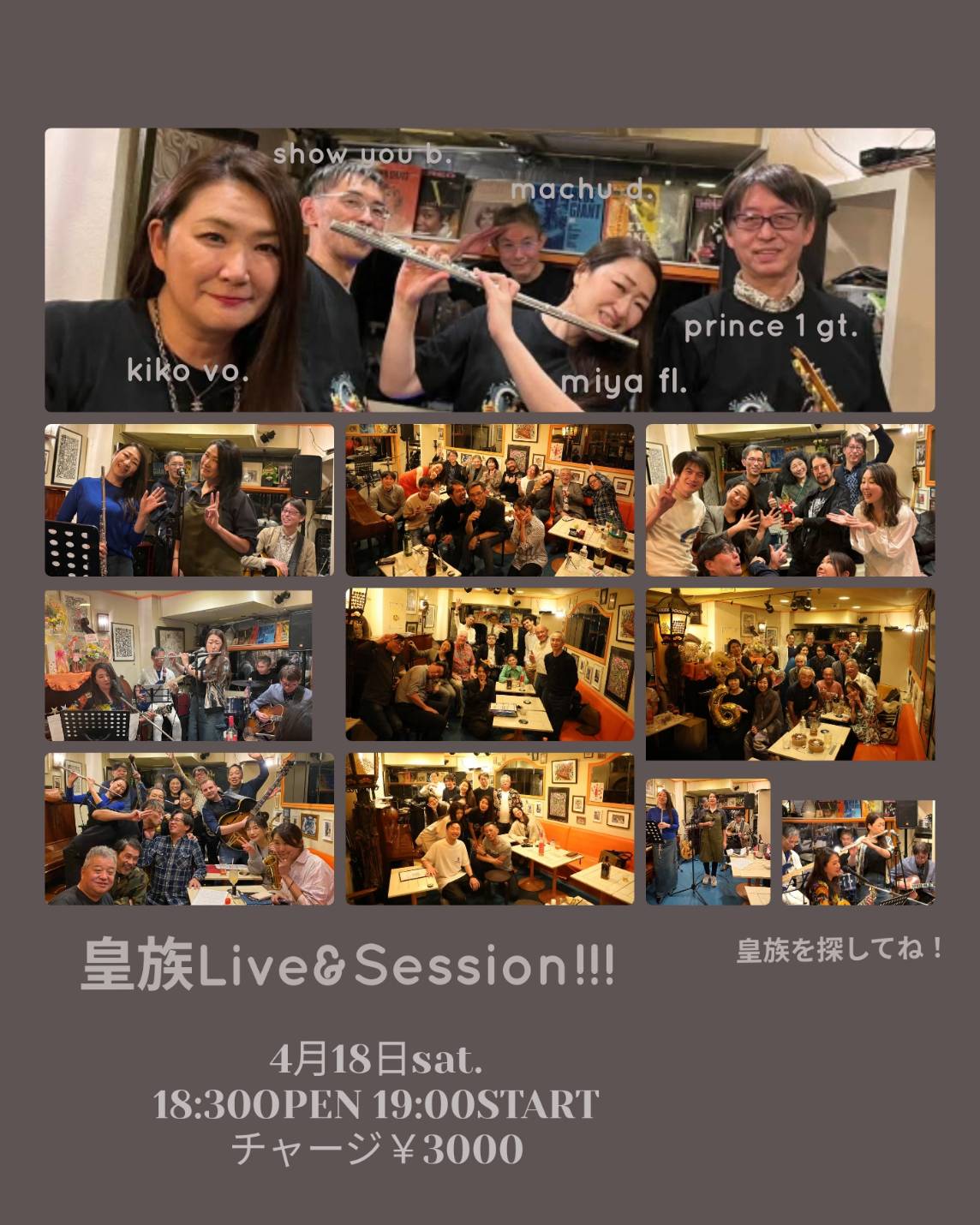 皇族ライブ&セッション 4月 18 Sat 2026 LIVEセッション 小林由果(Vo) 伊藤泰子(Fl) 加藤泉(Gt) 坂野尚雄(B) OPEN 18:30 SYART 19:00 CHARGE 3000 前のスケジュール 次のスケジュール