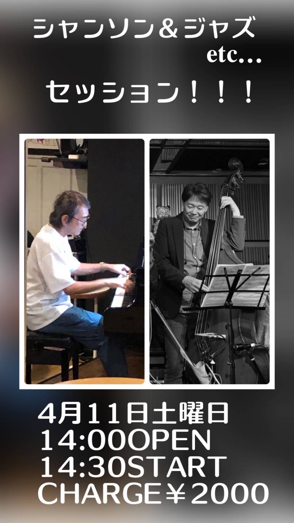 茂上剛and中村豊 Session! 4月 11 Sat 2026 セッション 茂上剛(B) 中村豊(Pf) OPEN 14:00 START 14:30 CHARGE 2000円 前のスケジュール 次のスケジュール