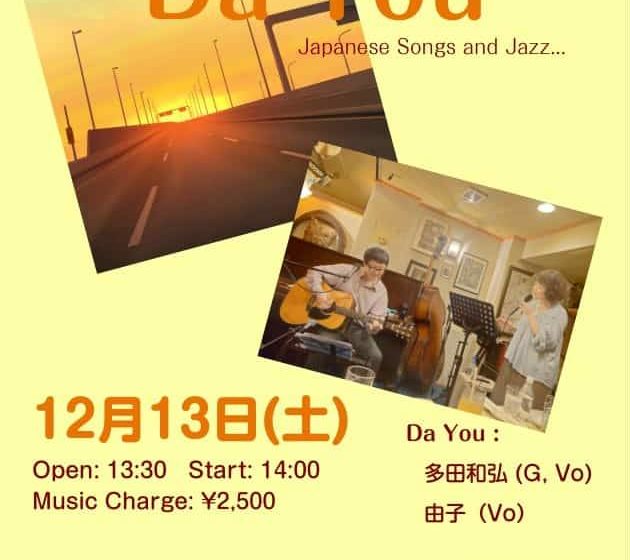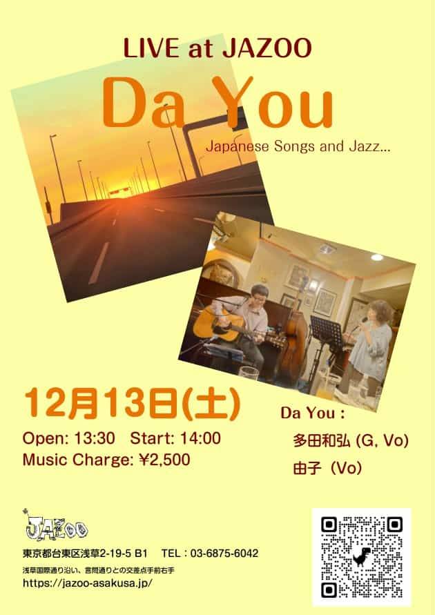 Da You!Live 12月 13 Sat 2025 LIVE Da You Live at JAZOO 林由子(Vo) 多田和弘(Gt) OPEN 13:30 START 14:00 CHARGE 2500 前のスケジュール 次のスケジュール