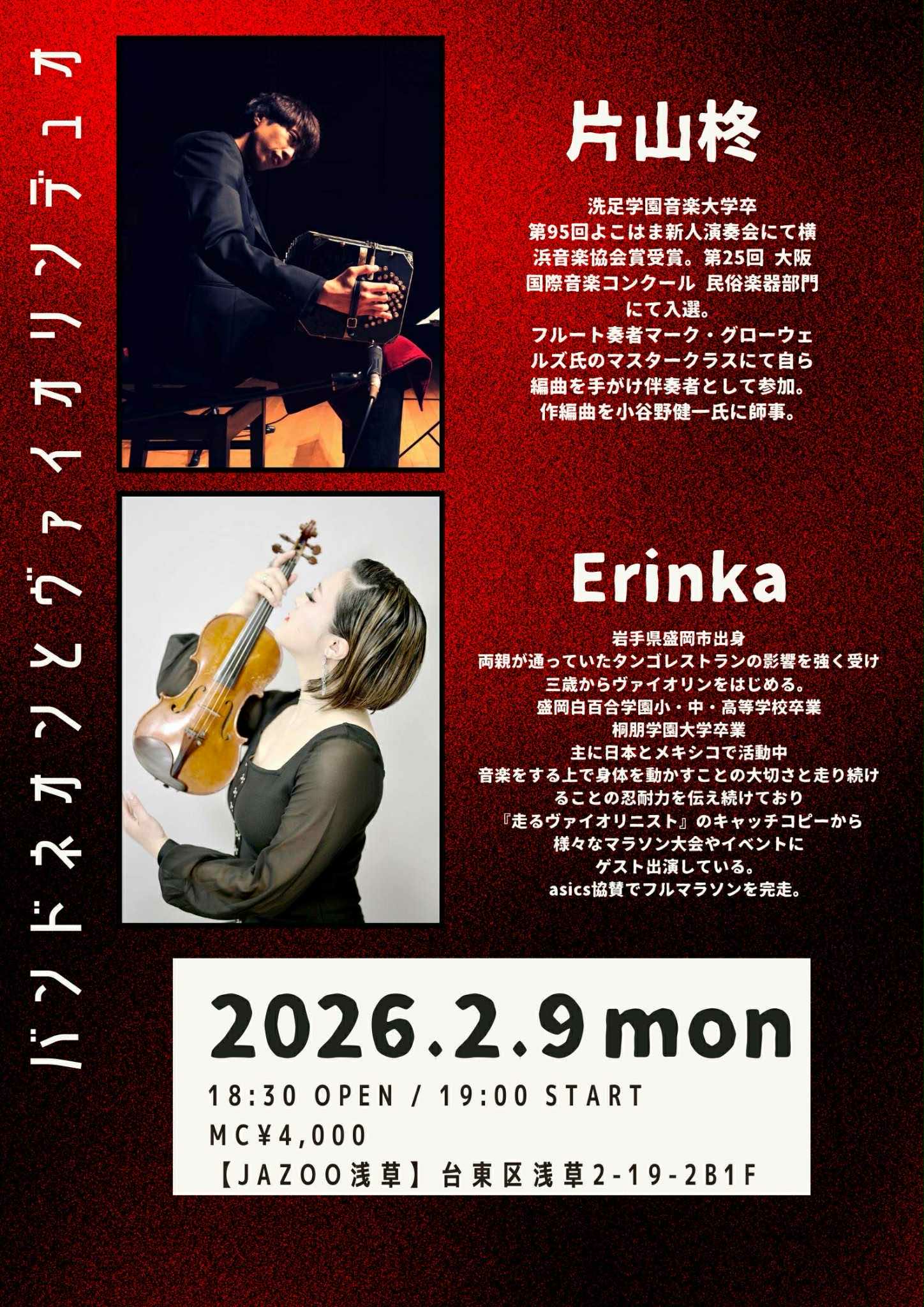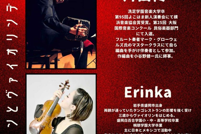 Erinka&片山柊Live 2月 9 Mon 2026 LIVE Erinka(Vn) 片山柊(Bandneon) OPEN 18:30 START 19:00 CHARGE 前のスケジュール 次のスケジュール
